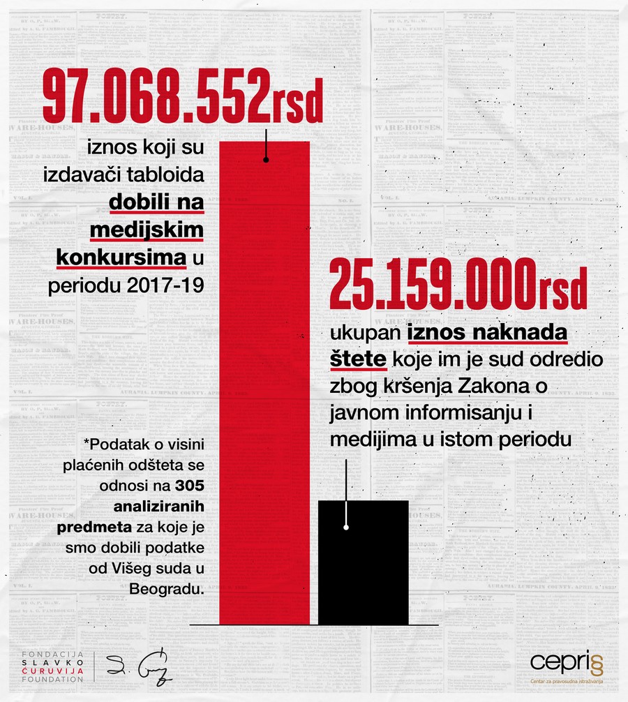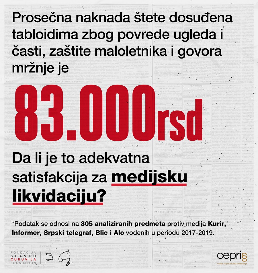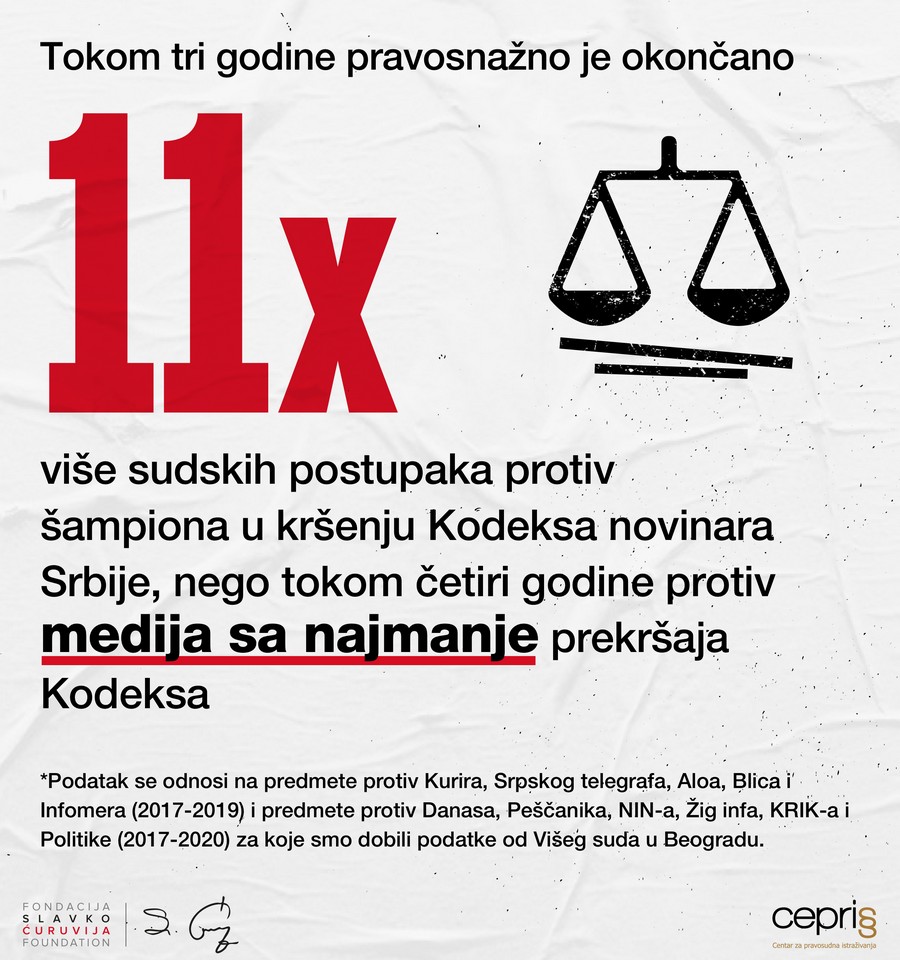 Za potrebe prvog istraživanja o zaštiti slobode izražavanja u pravosudnom sistemu Srbije, analizirano je 305 predmeta (2017-2019) u kojima su tuženi mediji koji, prema podacima Saveta za štampu, najčešće krše Kodeks novinara Srbije – Informer, Srpski telegraf, Kurir, Blic i Alo. U drugom istraživanju, predmet analize bilo je 27 predmeta (2017-2020) vođenih protiv medija koji, prema podacima SZŠ, imaju mali broj prekršaja Kodeksa – Danas, NIN, Žig info, KRIK i Peščanik. U ovim parnicama tužioci su novinari, nosioci vlasti, javne i političke ličnosti, ličnosti koje nisu poznate opštoj javnosti, ali jesu poznati u mestima u kojima žive kao lokalni funkcioneri, po profesiji koju obavljaju ili lica koja su označena kao izvršioci krivičnih dela. U odnosu na prvu grupu medija bio je pokrenut daleko veći broj postupaka pred Višim sudom u Beogradu, jedinom nadležnom sudu u Republici Srbiji za postupanje po tužbama za naknadu nematerijalne štete po Zakonu o javnom informisanju i medijima.